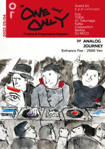 また、2FではTrance & Progressive classicsのパーティーOne and Onlyが同時開催。レジェンドYODAとDJ Tokunagaは勿論、ゲストDJにはMagnificentやLandscapeで2000年代中期以降の日本のトランスシーンに確かな足跡を残してきたsynが登場。